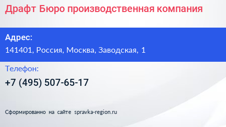 Драфт Бюро, производственная компания по адресу 141401, Россия, Москва, Заводская, 1 в дальнейшем Организация, размещена в следующих категориях: