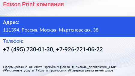 Edison Print, компания по адресу 111394, Россия, Москва, Мартеновская, 38 в дальнейшем Организация, размещена в следующих категориях: