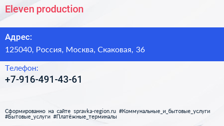 Eleven production по адресу 125040, Россия, Москва, Скаковая, 36 в дальнейшем Организация, размещена в следующих категориях: