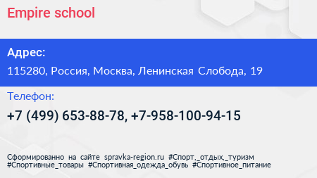 Empire school по адресу 115280, Россия, Москва, Ленинская Слобода, 19 в дальнейшем Организация, размещена в следующих категориях: