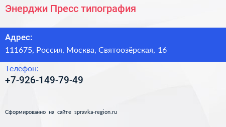 Энерджи Пресс, типография по адресу 111675, Россия, Москва, Святоозёрская, 16 в дальнейшем Организация, размещена в следующих категориях: