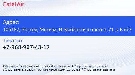 EstetAir по адресу 105187, Россия, Москва, Измайловское шоссе, 71 к В ст7 в дальнейшем Организация, размещена в следующих категориях: