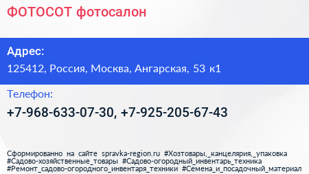 ФОТОСОТ, фотосалон по адресу 125412, Россия, Москва, Ангарская, 53 к1 в дальнейшем Организация, размещена в следующих категориях: