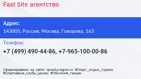 Fast Site, агентство по адресу 143005, Россия, Москва, Говорова, 163 в дальнейшем Организация, размещена в следующих категориях: