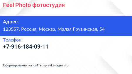 Feel Photo, фотостудия по адресу 123557, Россия, Москва, Малая Грузинская, 54 в дальнейшем Организация, размещена в следующих категориях: