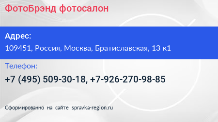 ФотоБрэнд, фотосалон по адресу 109451, Россия, Москва, Братиславская, 13 к1 в дальнейшем Организация, размещена в следующих категориях: