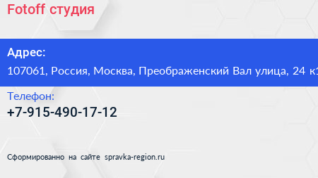 Fotoff, студия по адресу 107061, Россия, Москва, Преображенский Вал улица, 24 к1 в дальнейшем Организация, размещена в следующих категориях: