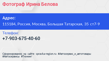 Фотограф Ирина Белова по адресу 115184, Россия, Москва, Большая Татарская, 35 ст7-9 в дальнейшем Организация, размещена в следующих категориях:
