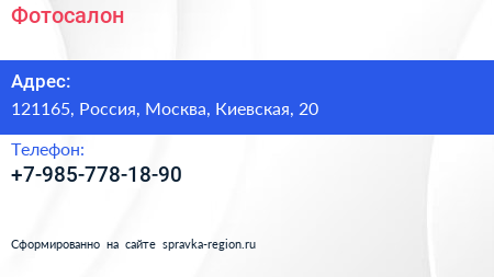 Фотосалон по адресу 121165, Россия, Москва, Киевская, 20 в дальнейшем Организация, размещена в следующих категориях: