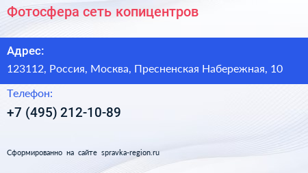 Фотосфера, сеть копицентров по адресу 123112, Россия, Москва, Пресненская Набережная, 10 в дальнейшем Организация, размещена в следующих категориях: