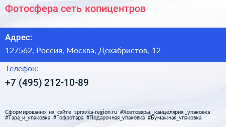 Фотосфера, сеть копицентров по адресу 127562, Россия, Москва, Декабристов, 12 в дальнейшем Организация, размещена в следующих категориях: