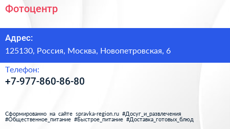 Фотоцентр по адресу 125130, Россия, Москва, Новопетровская, 6 в дальнейшем Организация, размещена в следующих категориях: