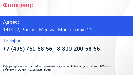 Фотоцентр по адресу 141402, Россия, Москва, Московская, 14 в дальнейшем Организация, размещена в следующих категориях:
