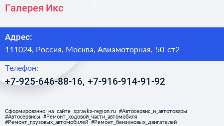 Галерея Икс по адресу 111024, Россия, Москва, Авиамоторная, 50 ст2 в дальнейшем Организация, размещена в следующих категориях: