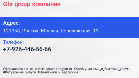 Gbr-group, компания по адресу 121353, Россия, Москва, Беловежская, 13 в дальнейшем Организация, размещена в следующих категориях: