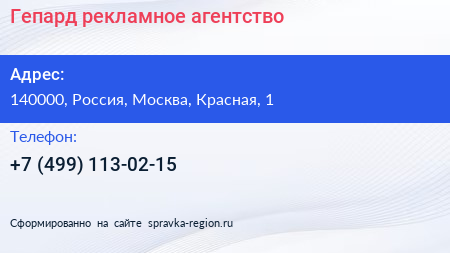 Гепард, рекламное агентство по адресу 140000, Россия, Москва, Красная, 1 в дальнейшем Организация, размещена в следующих категориях: