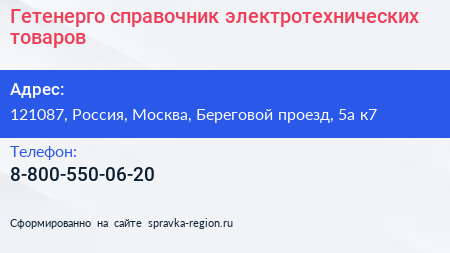 Гетенерго, справочник электротехнических товаров по адресу 121087, Россия, Москва, Береговой проезд, 5а к7 в дальнейшем Организация, размещена в следующих категориях: