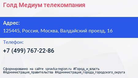 Голд-Медиум, телекомпания по адресу 125445, Россия, Москва, Валдайский проезд, 16 в дальнейшем Организация, размещена в следующих категориях: