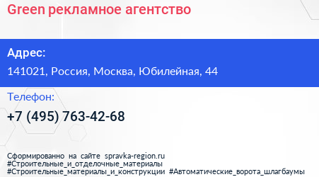 Green, рекламное агентство по адресу 141021, Россия, Москва, Юбилейная, 44 в дальнейшем Организация, размещена в следующих категориях: