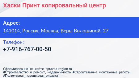 Хаски Принт, копировальный центр по адресу 141014, Россия, Москва, Веры Волошиной, 27 в дальнейшем Организация, размещена в следующих категориях: