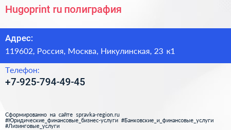 Hugoprint.ru, полиграфия по адресу 119602, Россия, Москва, Никулинская, 23 к1 в дальнейшем Организация, размещена в следующих категориях: