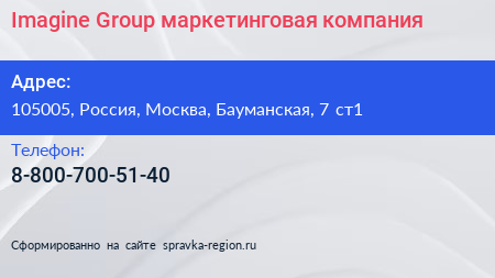 Imagine Group, маркетинговая компания по адресу 105005, Россия, Москва, Бауманская, 7 ст1 в дальнейшем Организация, размещена в следующих категориях: