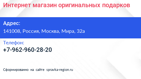 Интернет-магазин оригинальных подарков по адресу 141008, Россия, Москва, Мира, 32а в дальнейшем Организация, размещена в следующих категориях:
