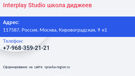 Interplay Studio, школа диджеев по адресу 117587, Россия, Москва, Кировоградская, 9 к1 в дальнейшем Организация, размещена в следующих категориях:
