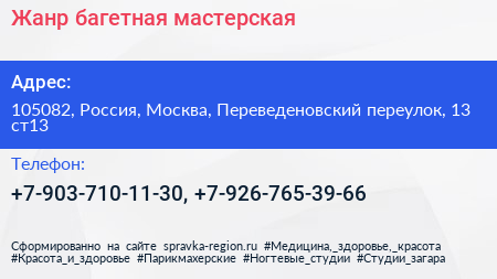 Жанр, багетная мастерская по адресу 105082, Россия, Москва, Переведеновский переулок, 13 ст13 в дальнейшем Организация, размещена в следующих категориях: