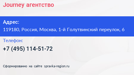 Journey, агентство по адресу 119180, Россия, Москва, 1-й Голутвинский переулок, 6 в дальнейшем Организация, размещена в следующих категориях: