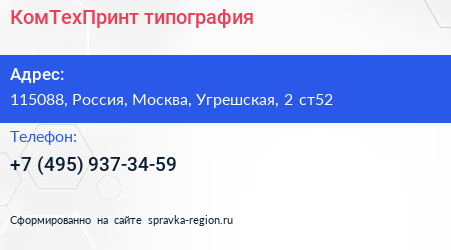 КомТехПринт, типография по адресу 115088, Россия, Москва, Угрешская, 2 ст52 в дальнейшем Организация, размещена в следующих категориях: