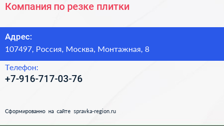 Компания по резке плитки по адресу 107497, Россия, Москва, Монтажная, 8 в дальнейшем Организация, размещена в следующих категориях: