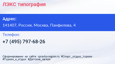 ЛЭКС, типография по адресу 141407, Россия, Москва, Панфилова, 4 в дальнейшем Организация, размещена в следующих категориях: