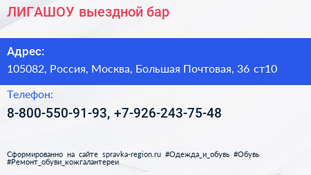ЛИГАШОУ, выездной бар по адресу 105082, Россия, Москва, Большая Почтовая, 36 ст10 в дальнейшем Организация, размещена в следующих категориях: