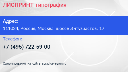 ЛИСПРИНТ, типография по адресу 111024, Россия, Москва, шоссе Энтузиастов, 17 в дальнейшем Организация, размещена в следующих категориях: