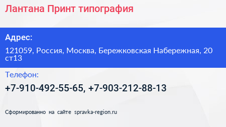 Лантана-Принт, типография по адресу 121059, Россия, Москва, Бережковская Набережная, 20 ст13 в дальнейшем Организация, размещена в следующих категориях: