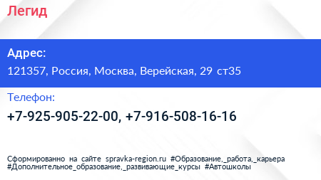 Легид по адресу 121357, Россия, Москва, Верейская, 29 ст35 в дальнейшем Организация, размещена в следующих категориях: