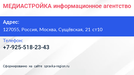 МЕДИАСТРОЙКА, информационное агентство по адресу 127055, Россия, Москва, Сущёвская, 21 ст10 в дальнейшем Организация, размещена в следующих категориях: