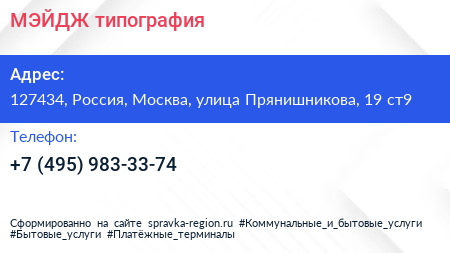 МЭЙДЖ, типография по адресу 127434, Россия, Москва, улица Прянишникова, 19 ст9 в дальнейшем Организация, размещена в следующих категориях: