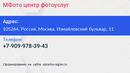 МФото, центр фотоуслуг по адресу 105264, Россия, Москва, Измайловский бульвар, 11 в дальнейшем Организация, размещена в следующих категориях: