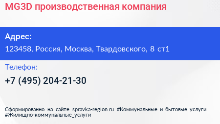 MG3D, производственная компания по адресу 123458, Россия, Москва, Твардовского, 8 ст1 в дальнейшем Организация, размещена в следующих категориях: