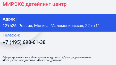 МИРЭКС, детейлинг-центр по адресу 129626, Россия, Москва, Маломосковская, 22 ст11 в дальнейшем Организация, размещена в следующих категориях: