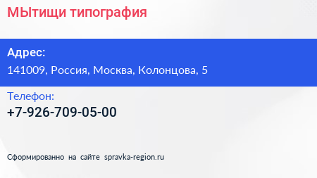 МЫтищи, типография по адресу 141009, Россия, Москва, Колонцова, 5 в дальнейшем Организация, размещена в следующих категориях:
