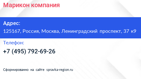 Марикон, компания по адресу 125167, Россия, Москва, Ленинградский проспект, 37 к9 в дальнейшем Организация, размещена в следующих категориях: