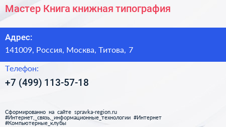 Мастер Книга, книжная типография по адресу 141009, Россия, Москва, Титова, 7 в дальнейшем Организация, размещена в следующих категориях: