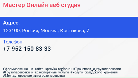 Мастер.Онлайн, веб-студия по адресу 123100, Россия, Москва, Костикова, 7 в дальнейшем Организация, размещена в следующих категориях: