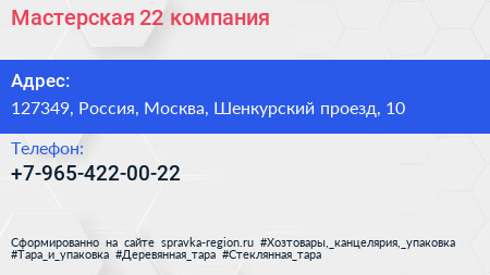 Мастерская 22, компания по адресу 127349, Россия, Москва, Шенкурский проезд, 10 в дальнейшем Организация, размещена в следующих категориях: