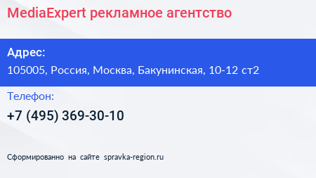 MediaExpert, рекламное агентство по адресу 105005, Россия, Москва, Бакунинская, 10-12 ст2 в дальнейшем Организация, размещена в следующих категориях: