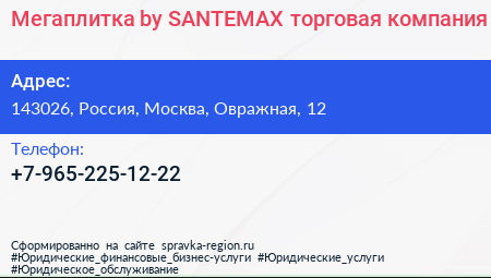 Мегаплитка by SANTEMAX, торговая компания по адресу 143026, Россия, Москва, Овражная, 12 в дальнейшем Организация, размещена в следующих категориях: