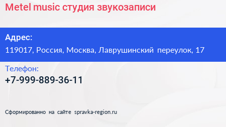 Metel music, студия звукозаписи по адресу 119017, Россия, Москва, Лаврушинский переулок, 17 в дальнейшем Организация, размещена в следующих категориях: